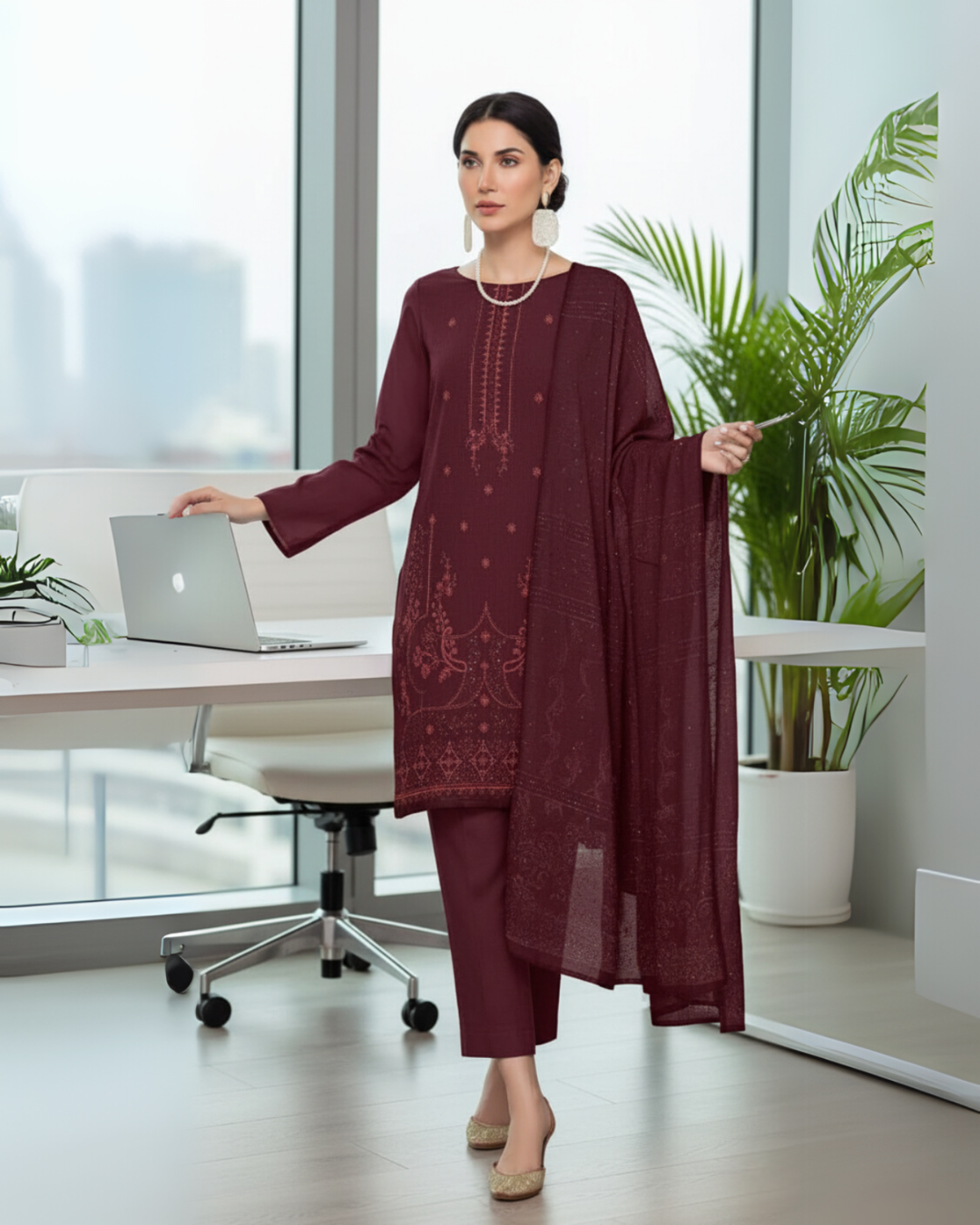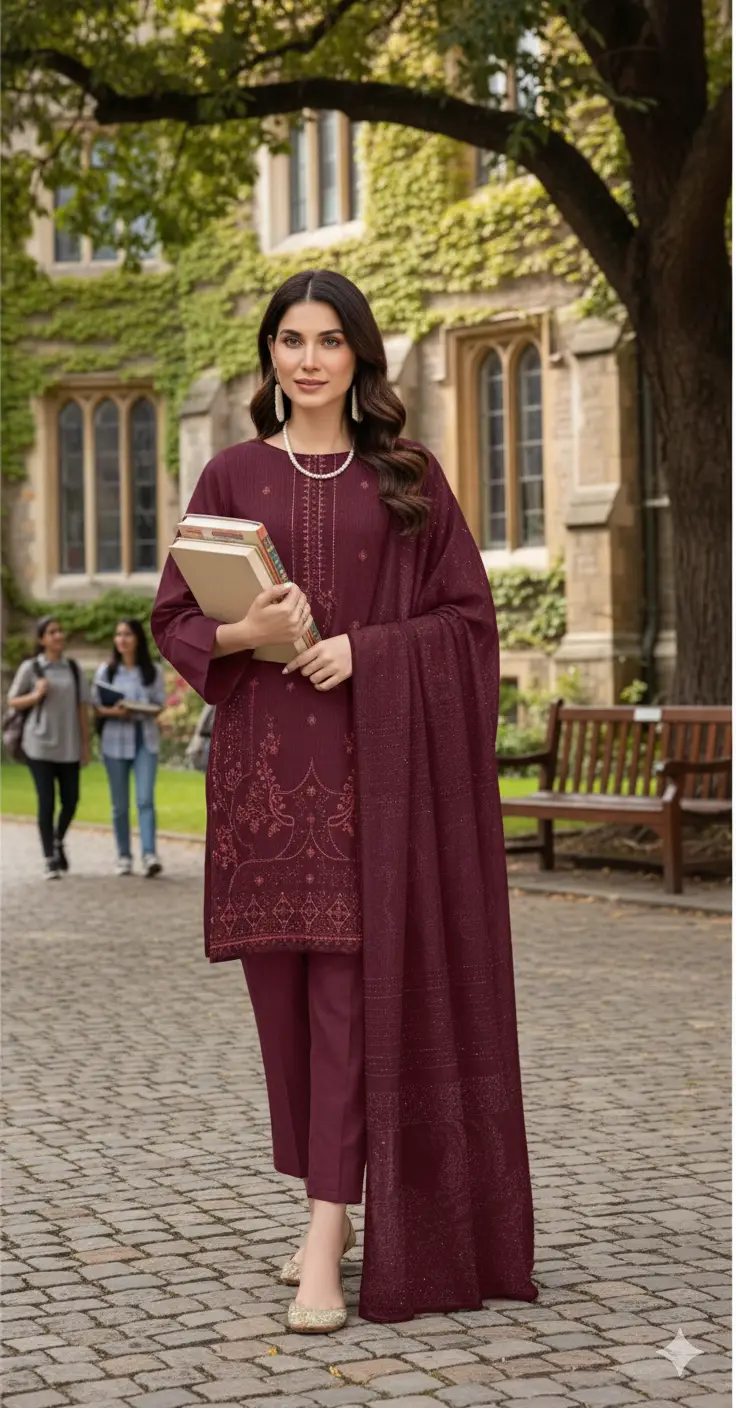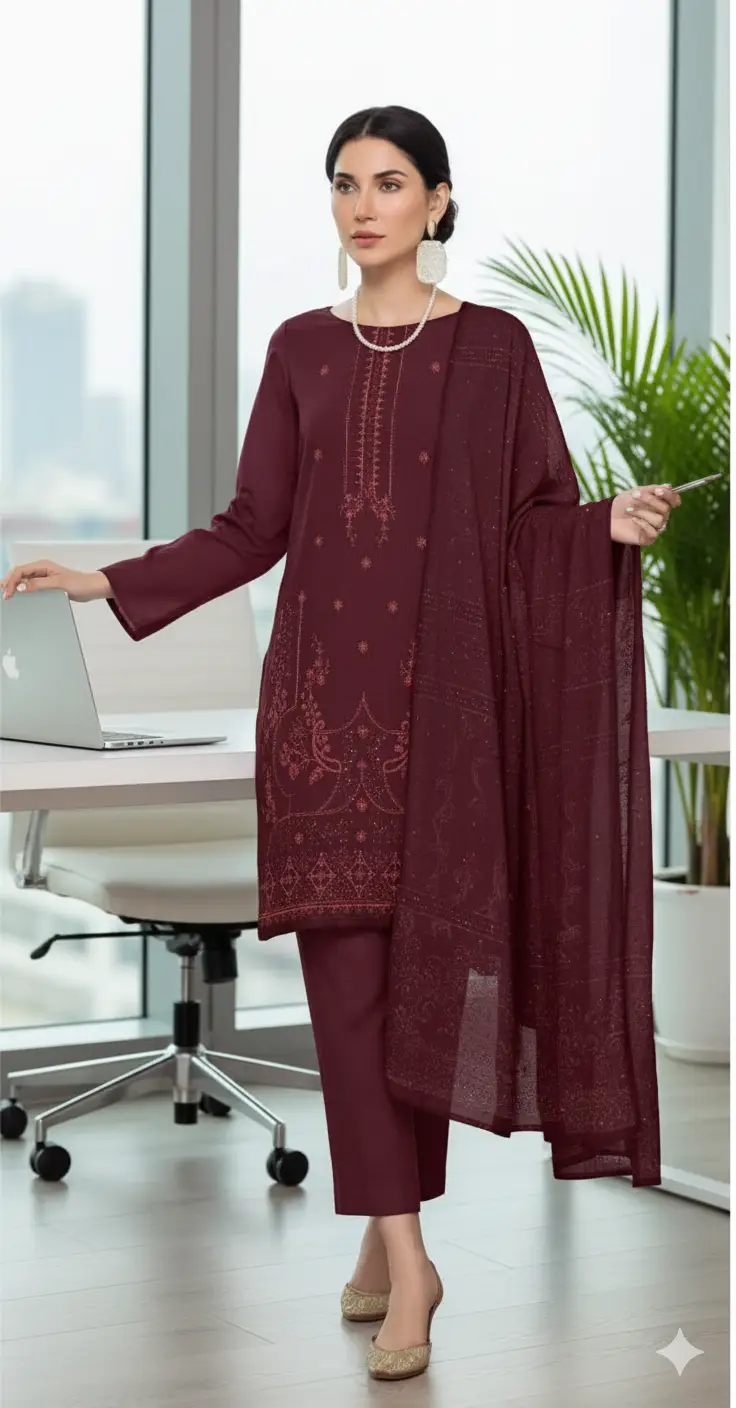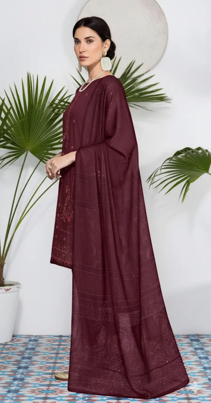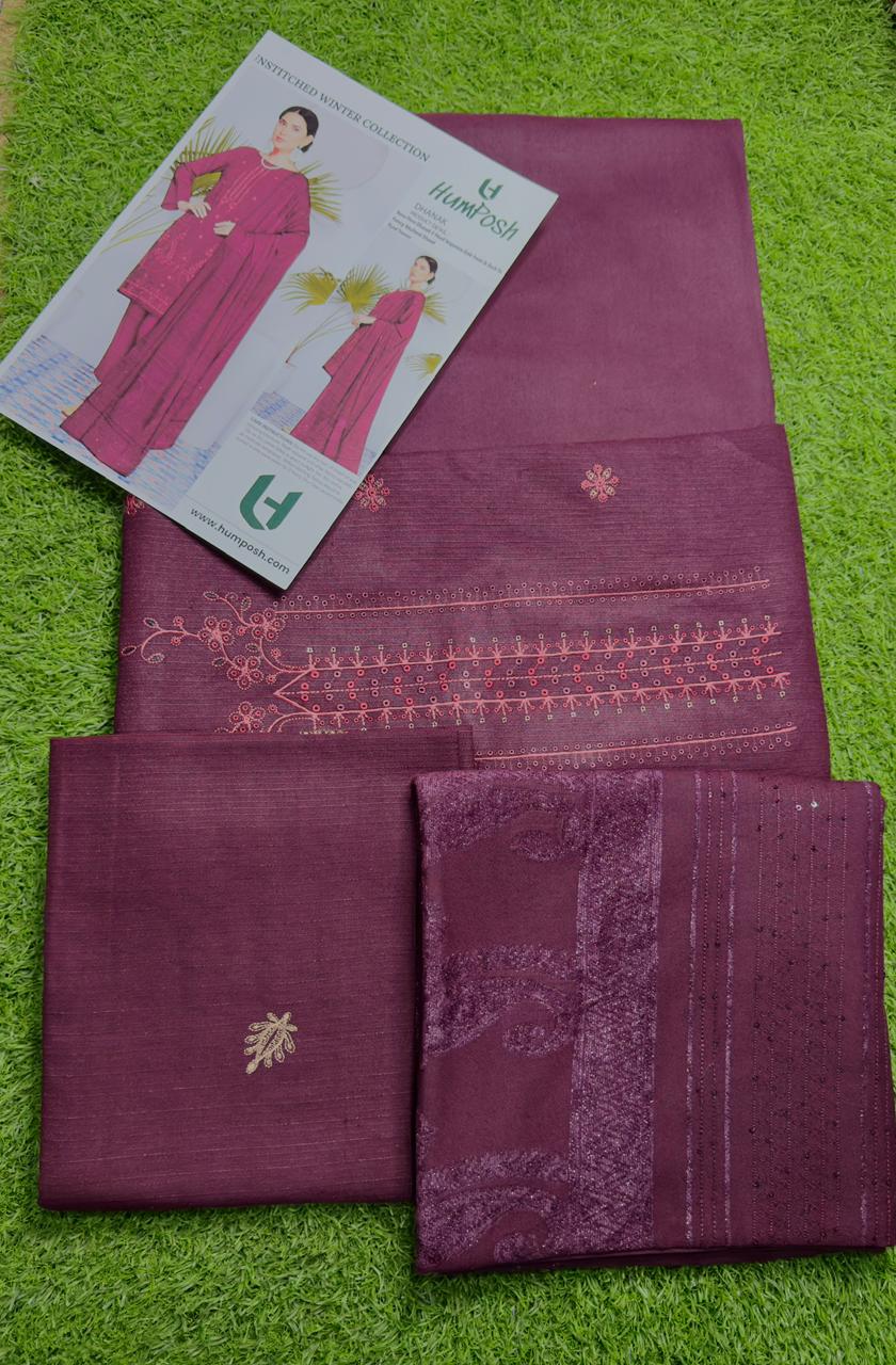 A premium 3-piece unstitched suit from Humposh Premium Collection, crafted with elegance and tradition. Featuring rich embroidery on the front and back, paired with a luxurious Multani shawl and a dyed trouser – perfect for office wear, university style, and timeless casual elegance.