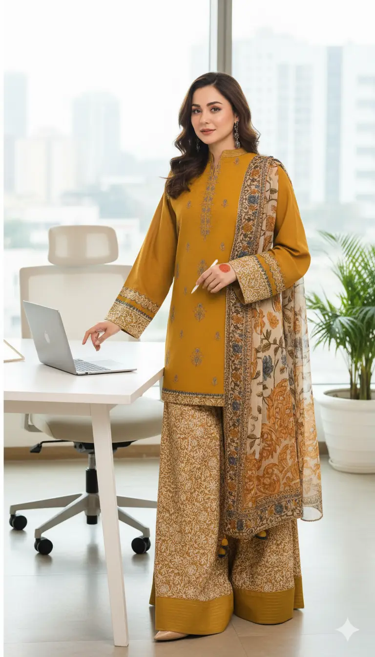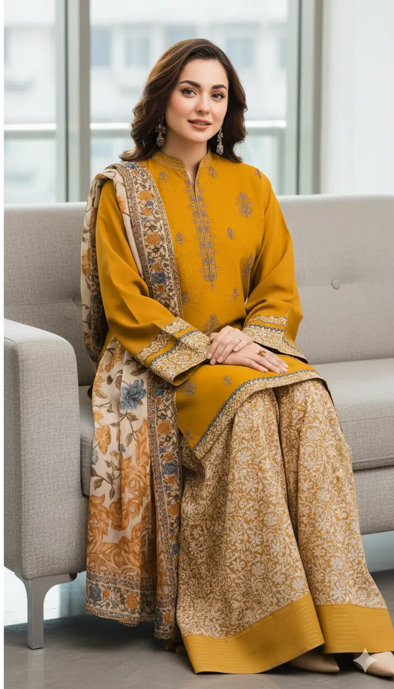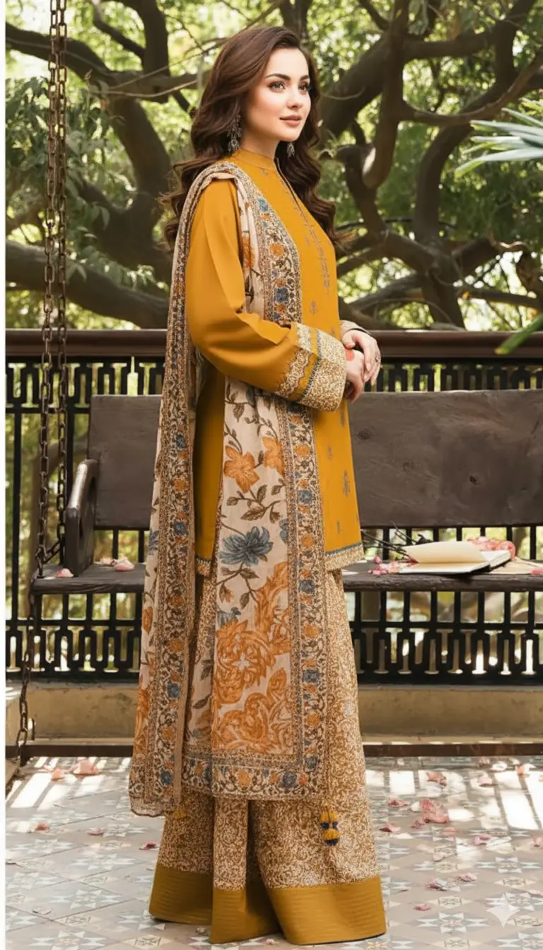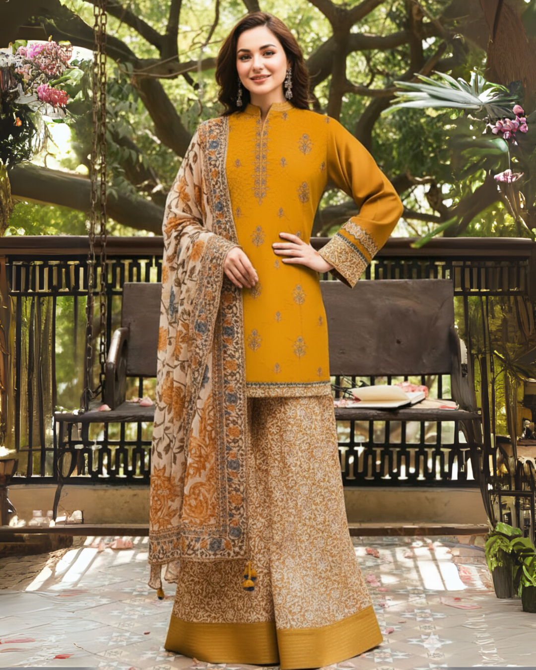 Unstitched 3-Piece Dhanak Suit featuring an embroidered shirt, printed dupatta, and premium dyed trouser – stylish yet affordable