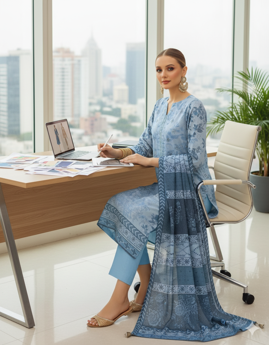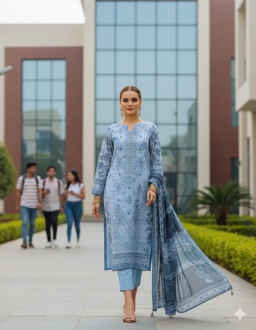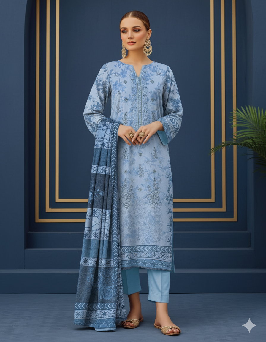 Unstitched 3-Piece Dhanak Suit featuring an embroidered shirt, printed dupatta, and premium dyed trouser – stylish yet affordable