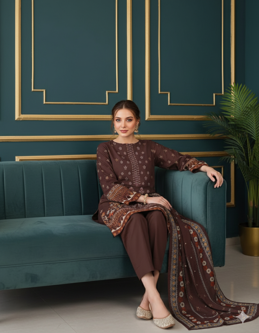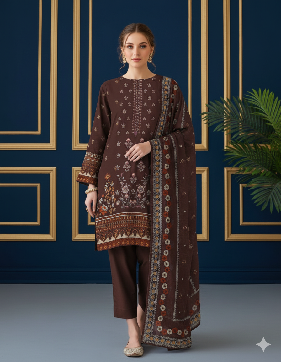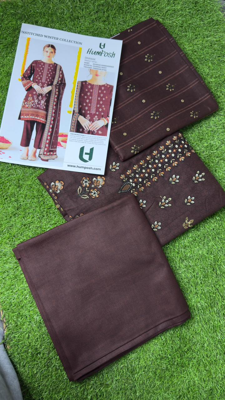 Unstitched 3-Piece Dhanak Suit featuring an embroidered shirt, printed dupatta, and premium dyed trouser – stylish yet affordable